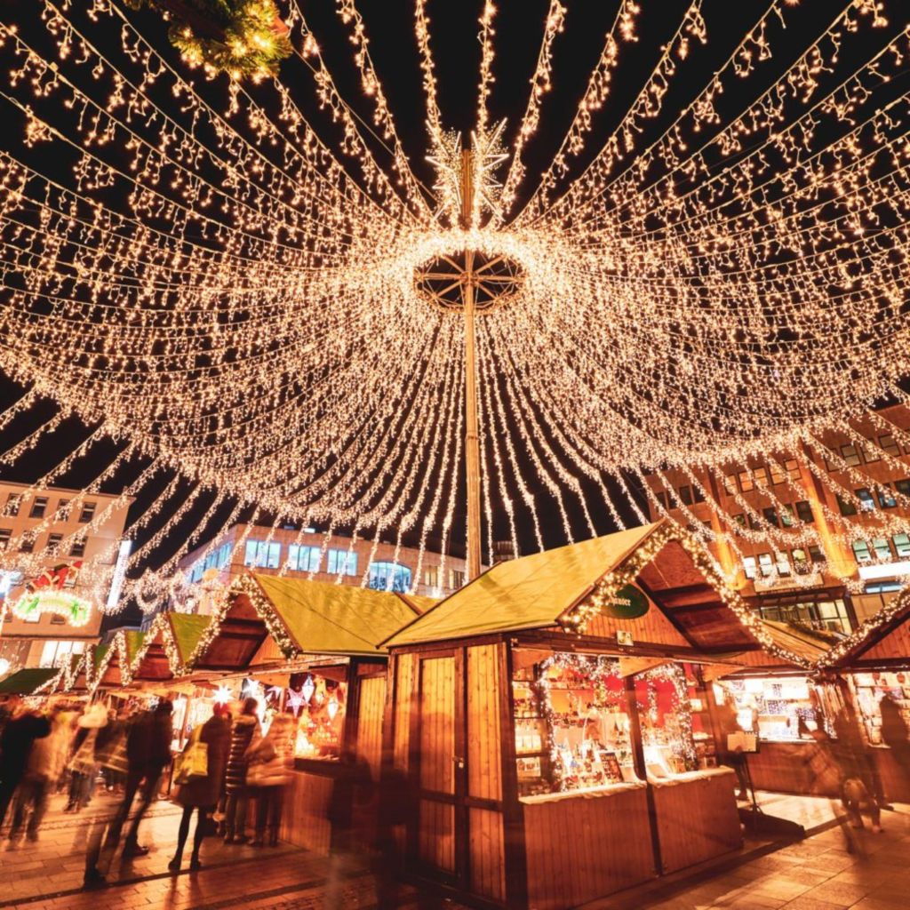 Het marktplein van Essen wordt getransformeerd in een betoverend winterwonderland met schitterende lichtdecoraties en feestelijke kerstbomen. De kraampjes bieden een overvloed aan ambachtelijke producten.